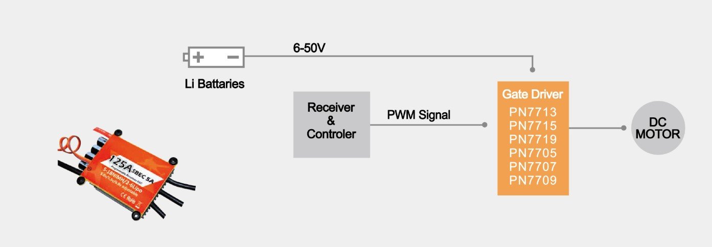 Based on wide-voltage lithium battery power supply, the scheme builds an efficient driving link of “Receiver & Controller + Gate Driver + DC Motor”: